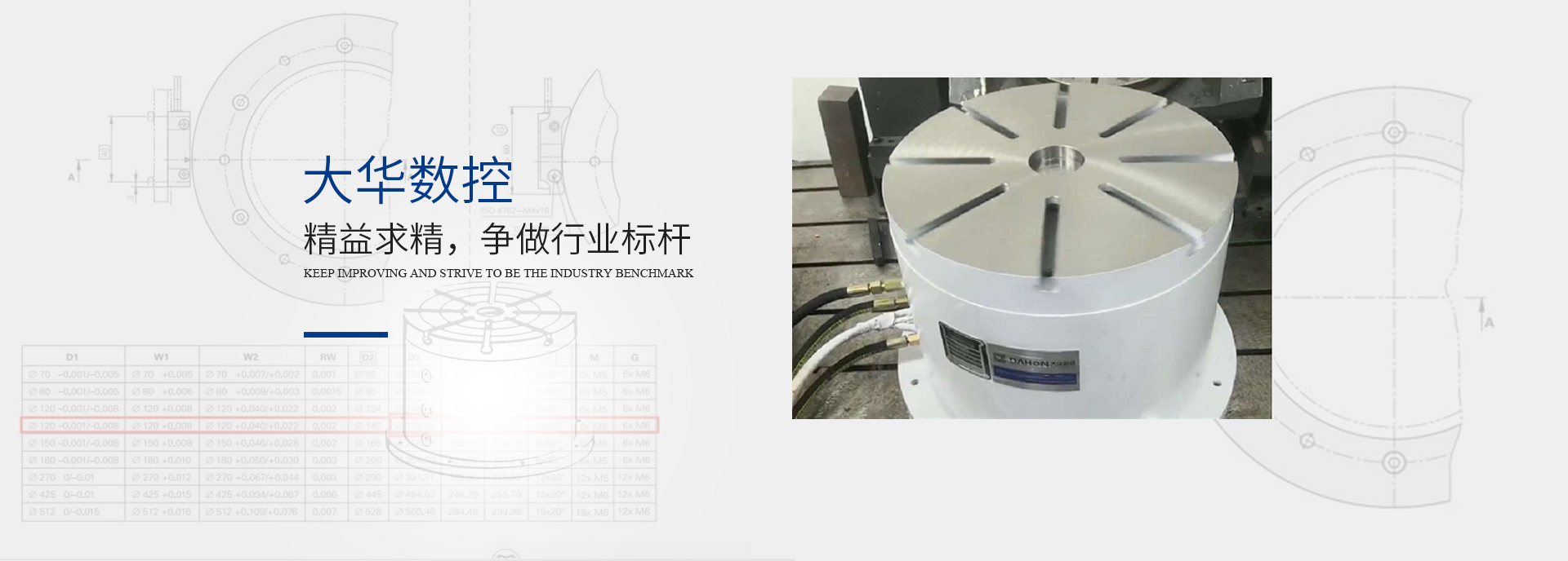 大華數控瞄準高速、高精、數控機床對機床附件的迫切需求,以自主知識產權技術研發為核心,融合機床制造技術進行集成創新,與優良配套加工制造企業緊密合作,堅持技術先導戰略,“大”研發、“精”制造、“高”技術,“優”產品,致力于核心技術的研發、推廣及應用,將為數控機械的綠色、節能、環保、高精需求提供有力支撐,精心打造“大華”品牌,目標 —— 成為行業領軍者!